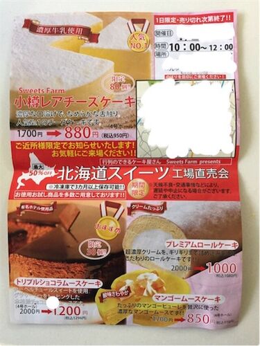 ある日不思議なチラシがポストに入りました。 有名ホテルや高級レストランで使用されるスイーツが安く販売されるらしいんですが… なぜか1日だけの限定の販売で、販売時間もたったの2時間ぽっきり。 そして,なぜか販売場所の住所の記載がない。(〇〇町△丁目…